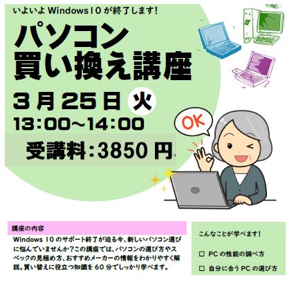 Windows 10 のサポート終了が迫る今、新しいパソコン選びに悩んでいませんか?この講座では、パソコンの選び方やスペックの見極め方、おすすめメーカーの情報をわかりやすく解説します。買い替えに役立つ知識を60分でしっかり学べます。 ●料金 3850円