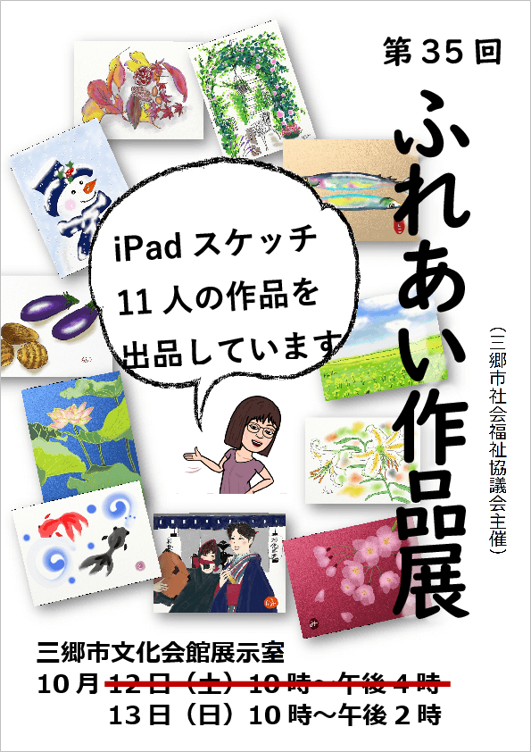 開催期間:2019-10-13~2019-10-13iPadお絵かきクラスのお知らせです。 三郷市社会福祉協議会主催「第35回ふれあい作品展」に iPadお絵かきクラスのスケッチ作品を初出品しています。 どれも力作揃いの素晴らしい作品です。 ぜひ多くの方にご覧いただけると嬉しいです。