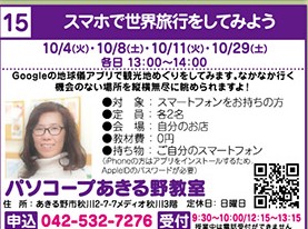 講座型、体験型、さまざまな講座が開催されますが、あきる野教室では、なかなか旅行にも行けない昨今「スマホで世界旅行」を楽しんで頂きます