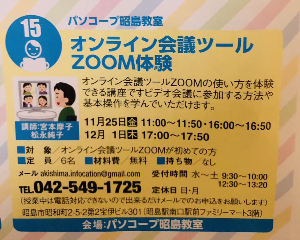 | 開催概要: | オンライン会議ツールZOOMの使い方を体験できる講座ですビデオ会議に参加する方法や基本操作を学んでいただけます |