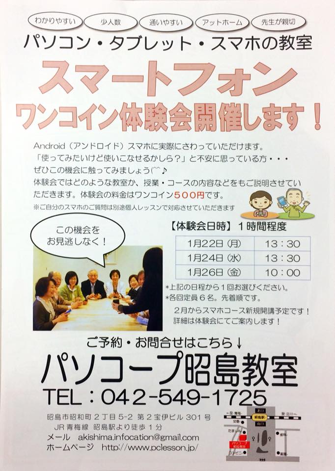 | 開催概要: | スマホデビューしたいけれど・・・使いこなせるか不安に思っている方・・・是非この機会に触ってみましょう。 貸出用のアンドロイドスマホに実際に触っていただけます。 体験会ではどのような教室か、授業やレッスン内容などもご説明させていただきます。 体験会の料金はワンコイン(500円)です。 |