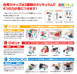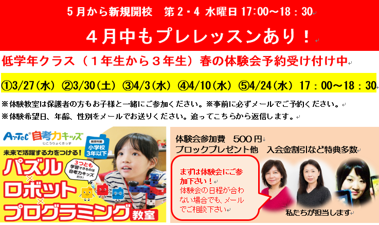 | 開催概要: | 年長さんから小学校3年生向けに楽しく自分で考える力を「パズル」「ロボット」「プログラミング」の3つのカリキュラムで学ぶクラスを新規開講します。2020年の小学校プログラミング教育必修化の前に低学年のうちに楽しく身につけましょう! |