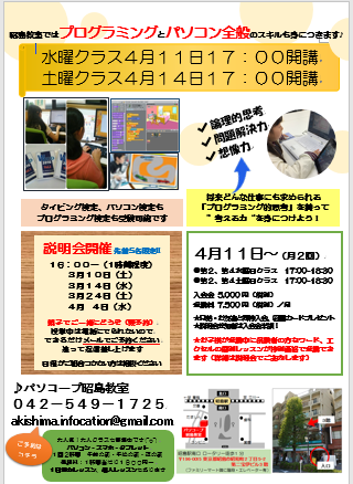 | 開催概要: | 4月11日~(月2回)水曜・土曜クラス 17:00-18:30 開講します無料説明会を開催します。先着5名限定!! 16:00~(1時間程度) 3月10日(土) 3月14日(水) 3月24日(土) 4月 4日(土) 親子でご一緒にどうぞ(要予約) 授業中は電話にでられないので できるだけメールakishima.infocation@gmail.comでご予約ください 追って返信差し上げます 日程がご都合つかない方は別途ご相談ください。 |