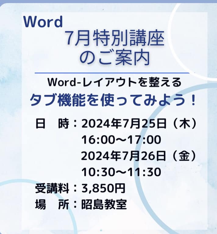 7月の特別講座 ワードのタブ機能を使って見栄えの良い文章を作ろう