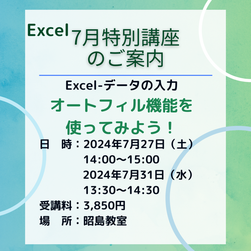 | 開催概要: | 7月特別講座のご案内 第2弾!Excel編 データの入力 「オートフィル機能を使ってみよう!」 |
