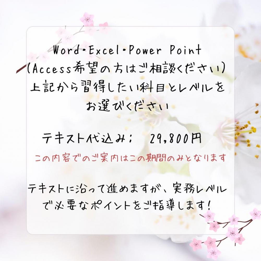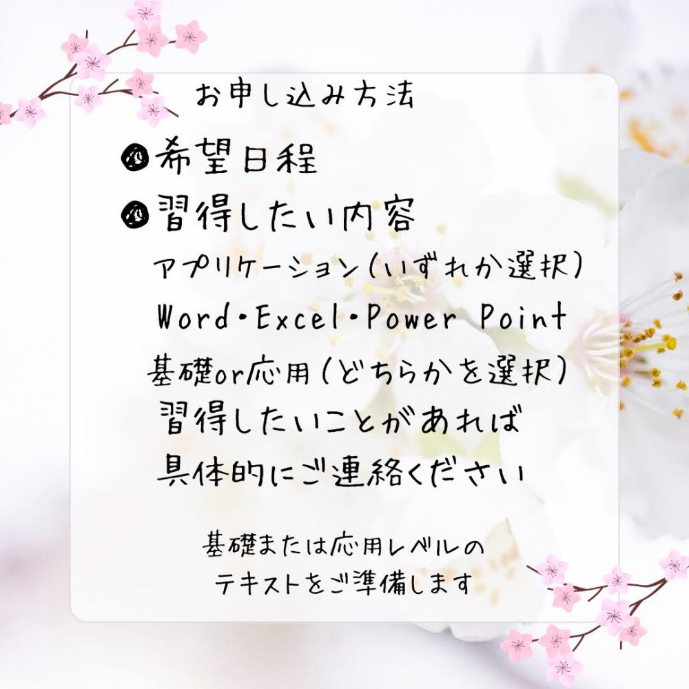 | 開催概要: | 『短期集中講座』お仕事に必要なスキルを1日6時間で、Word・ExcelやPowerPointを講師とマンツーマンでレッスンします (Access希望の方も応相談) お仕事をされている方向けに土・日開催 各開催日3日前までの申込になります |