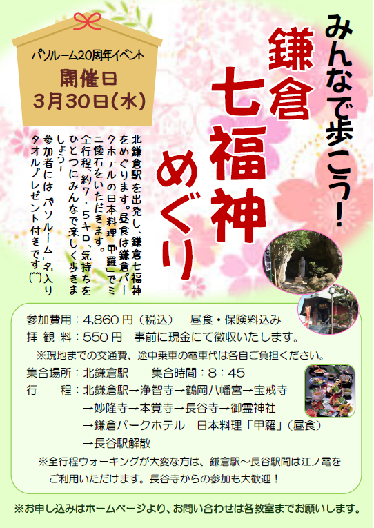 | 開催概要: | パソルーム20周年を記念して鎌倉七福神をみんなでウォーキングします。ランチは、鎌倉パークホテルの「甲羅」です。桜を見物しながら、みんなで気持ち良く歩きましょう! |