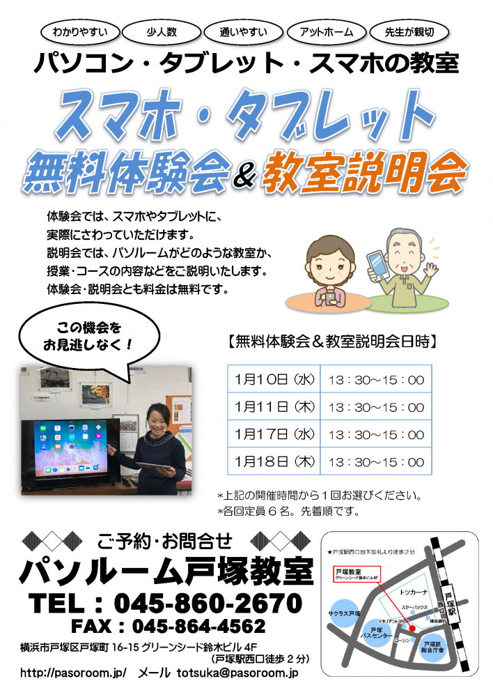 | 開催概要: | パソルーム新春企画、「スマホ・タブレット無料体験会&教室説明会」に、ぜひ一度いらしてみませんか? |