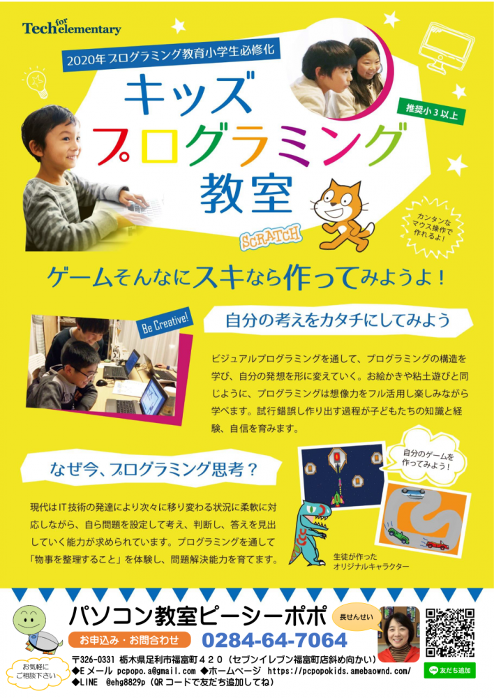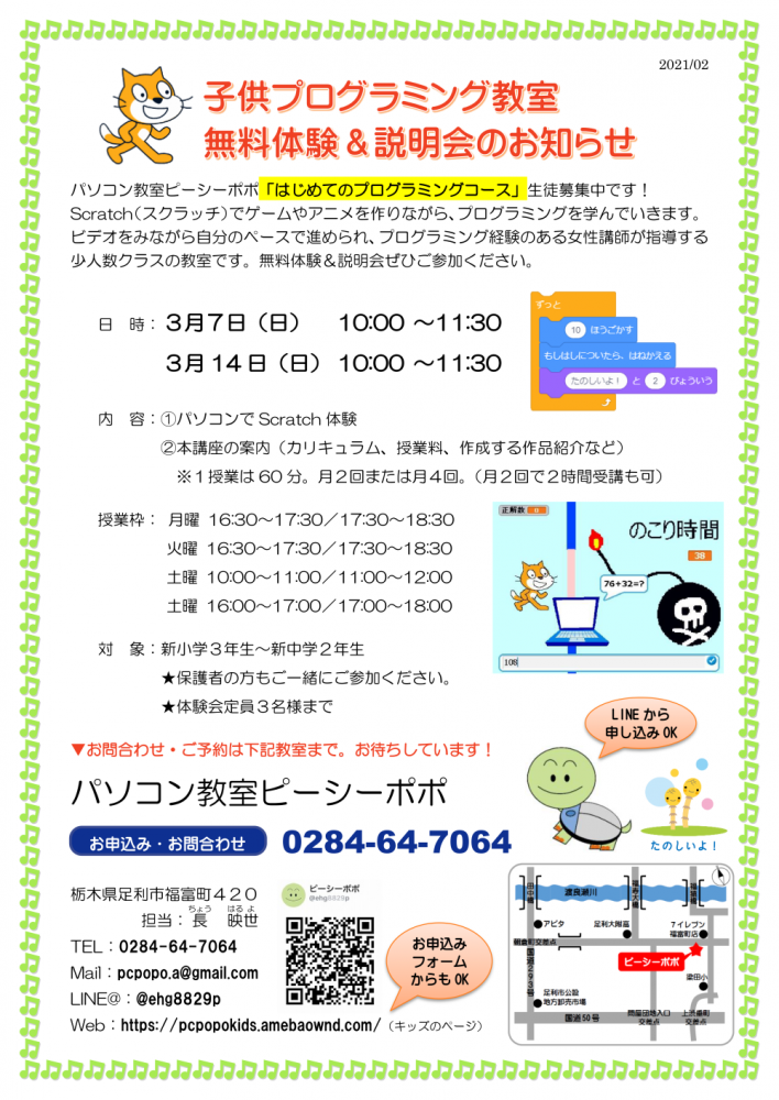 | 開催概要: | 4月からのプログラミング教室生徒募集中です!体験&説明会を行いますので、保護者の方もご一緒に是非ご参加ください! |
