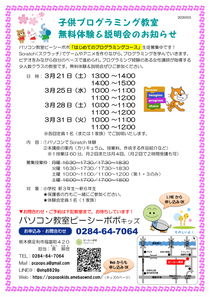 | 開催概要: | パソコン教室ピーシーポポ「はじめてのプログラミングコース」生徒募集中です!無料体験&説明会、ぜひご参加ください。 |