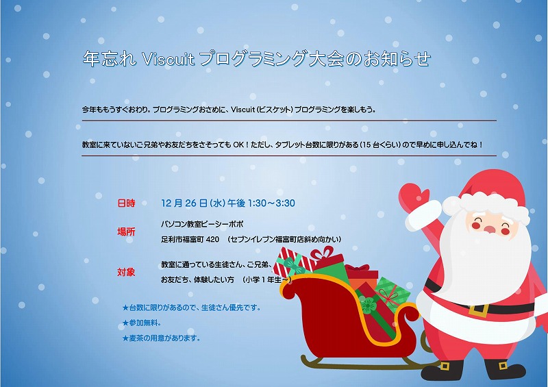 | 開催概要: | 今年ももうすぐ終わり。プログラミングおさめに、Viscuitプログラミングを楽しもう。生徒さんはもちろん、教室に来ていないお友だちも参加できます。 タブレット台数に限りがあるので、お早めにお申し込みください! キッスピアあしかがのはるよお姉さんも遊びに来るよ!(Wはるよで頑張ります♪) |