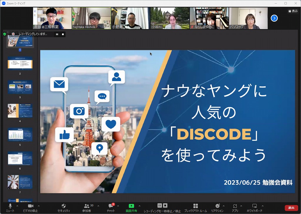 6月25日(日)9:15、パソコープ会員教室向け勉強会「ナウなヤングに人気の「Discode」を使ってみよう」をZoomオンラインにて実施しました。