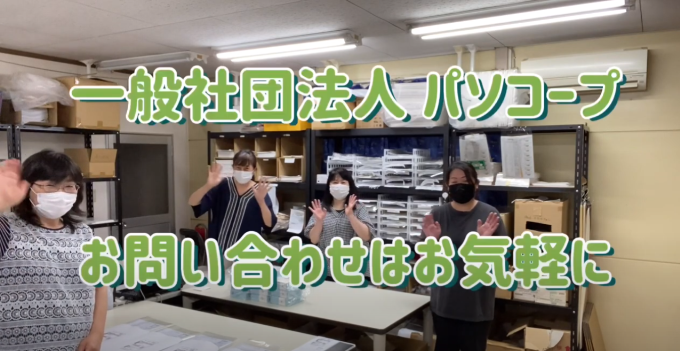 パソコープのテキストや物販発送、経理を担当する本庄事務局とスタッフ紹介の1分間のビデオです。