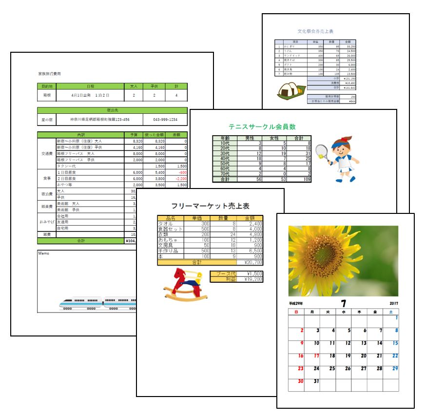 「家族旅行費用」「カレンダー」「文化祭食券売上表」を作成しながら、Excelの基本操作となる、オートコンプリートやセルの書式設定、罫線の機能、四則演算、合計の計算を習得します。