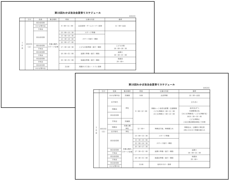 このテキストは、「W-0156 :自治会夏祭り役員編(1)」の続編です。ここでは、2日間にわたる夏祭りの各役員の準備と役割分担、仕事内容などをスケジュールにまとめ、Excelで作成します。