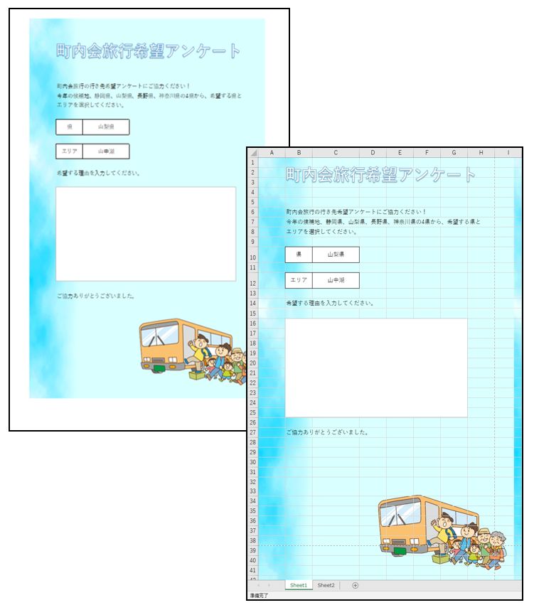 ここでは、県を選択すると、自動的にその県のエリアが別のセルのプルダウンメニューに表示される町内会旅行希望アンケートを作成します。シートの背面に画像を挿入し、より表現力豊かな作品に仕上げましょう。