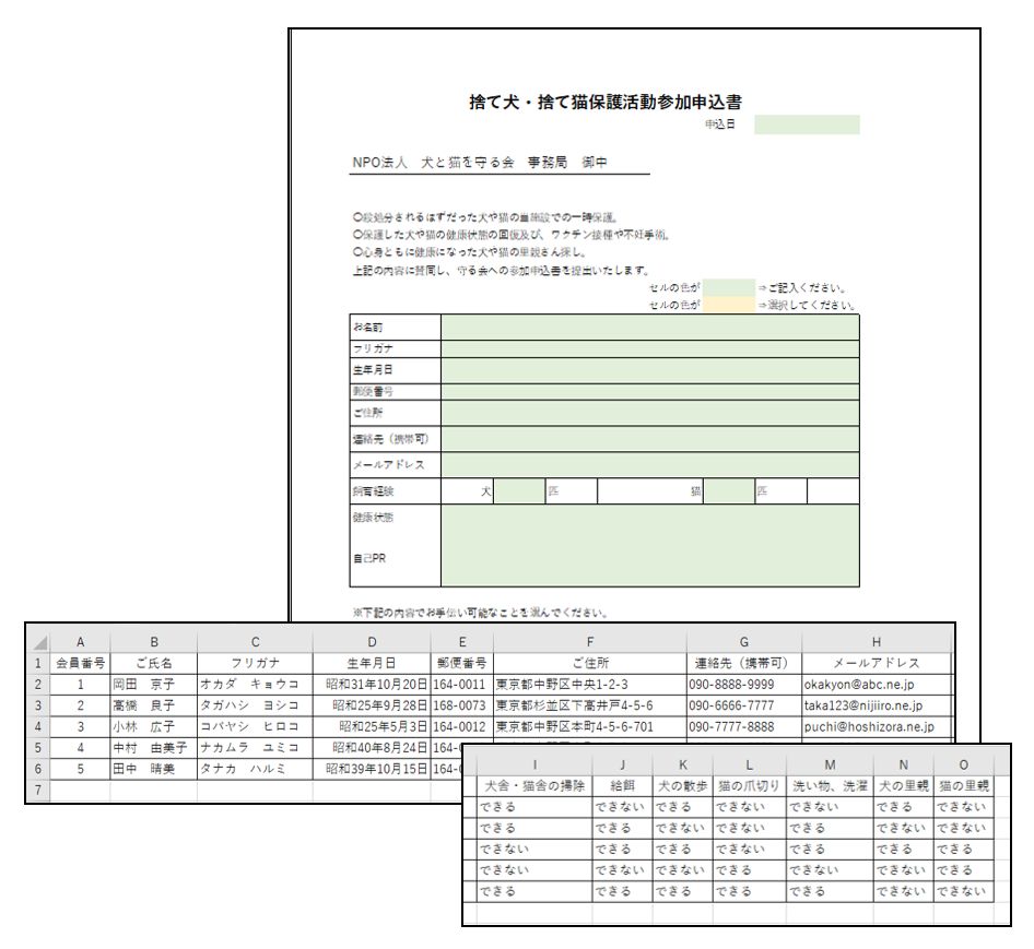 動物保護団体への入会申込書を作成します。入会希望者はExcelで作成された入会申込書に入力してメールで事務局に送ります。入力方法を統一するために入力規則を設定します。申込書を受け取った事務局はそれぞれの申込書をひとつにまとめ、一覧表を作成します。申込書のデータを効率よくコピーすることで入力の手間を省き、入力ミスも防ぐことができます。