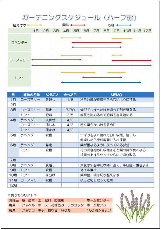 このレッスンでは、罫線と表作成機能を利用して、月ごとの作業がひとめでわるガーデニングスケジュールを作成します。3つの表をそれぞれ違った方法で作成し、後から項目を追加できるように、セルの分割や結合・行や列の追加などの編集方法も学習します。また、表の中に連番を簡単に入力するには段落番号を使用するのが便利です。