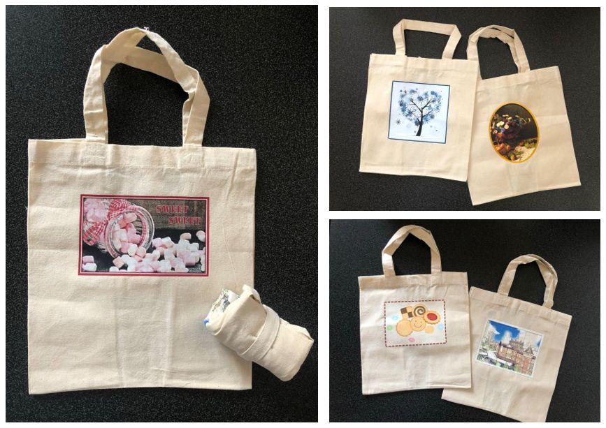 写真やイラストなどの画像を好きな図柄や形にデザインし、アイロンプリント用紙に印刷します。アイロンを使ってエコバッグに接着し、オリジナルの小さいエコバッグを作ります。