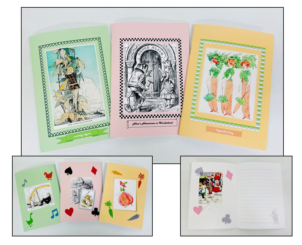 A4用紙半分のノートは、バッグに入れて持ち歩くのにちょうどよい大きさです。ノートのページは記入しやすいように行の幅を広めにとっています。このレッスンでは、アンティーク素材「不思議の国のアリス」のイラストを使って作成しています。季節の写真や旅の写真を使って作成するのもおすすめです。世界でたった1つのすてきなノートに仕上げましょう。