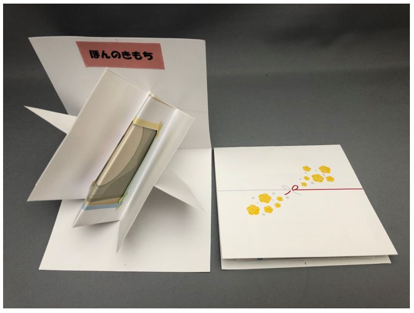 ツイストポチ袋とは、飛び出す仕掛けのポチ袋です。ポチ袋を開いた時にお札が飛び出す感じが印象的です。