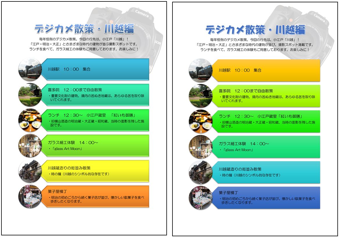 基本のSmartArtグラフィックに図形の追加や説明文の入力をして旅行行程表を作成しましょう。また、色の変更などをしてカラフルにしましょう。